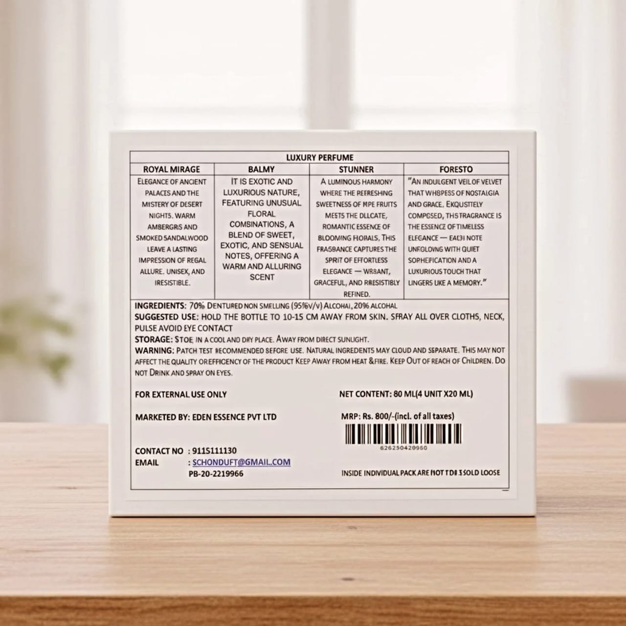 The Edenessence Signature Gift Set brings together four exquisite fragrances in one luxurious collection. Thoughtfully crafted for every mood and occasion, each scent captures elegance, depth, and individuality. Beautifully packaged, this 4-piece set makes the perfect gift of timeless fragrance—whether for yourself or a loved one.